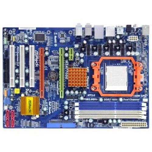 Model: M3A770DE, CPU Socket Type LGA: AM3, CPU Type: Phenom II / Athlon II / Sempron 100 Series Support CPU up to 140W., FSB: 2600MHz Hyper Transport (5200 MT/s), Chipsets : North Bridge AMD 770, South Bridge AMD AB710, Memory:, Number of Memory Slots- 4×240pin;, Memory Standard- DDR3 1600;, Channel Supported- Dual Channel., Expansion Slots:, PCI Express 2.0 x16- 2;, PCI Express x1-1;, PCI Slots-3., Storage Devices:, PATA- 1 x ATA133 2 Dev. Max;, SATA- 3Gb/s- 4., Audio Channels: 8 Channels, Max LAN Speed: 10/100/1000Mbps, Rear Panel Ports: , eSATA-2 x eSATA 3Gb/s; S/PDIF Out- 1 x Optical, 1 x Coaxial; Audio Ports- 6 Ports., Physical Spec:, Form Factor- ATX, Power Pin- 24 Pin, Features:, EuP Ready;, Support AMD OverDrive with ACC feature;, Support ATI CrossFireX;, Supports ASRock Instant Boot, Instant Flash, Smart BIOS, ASRock OC Tuner, Intelligent Energy Saver